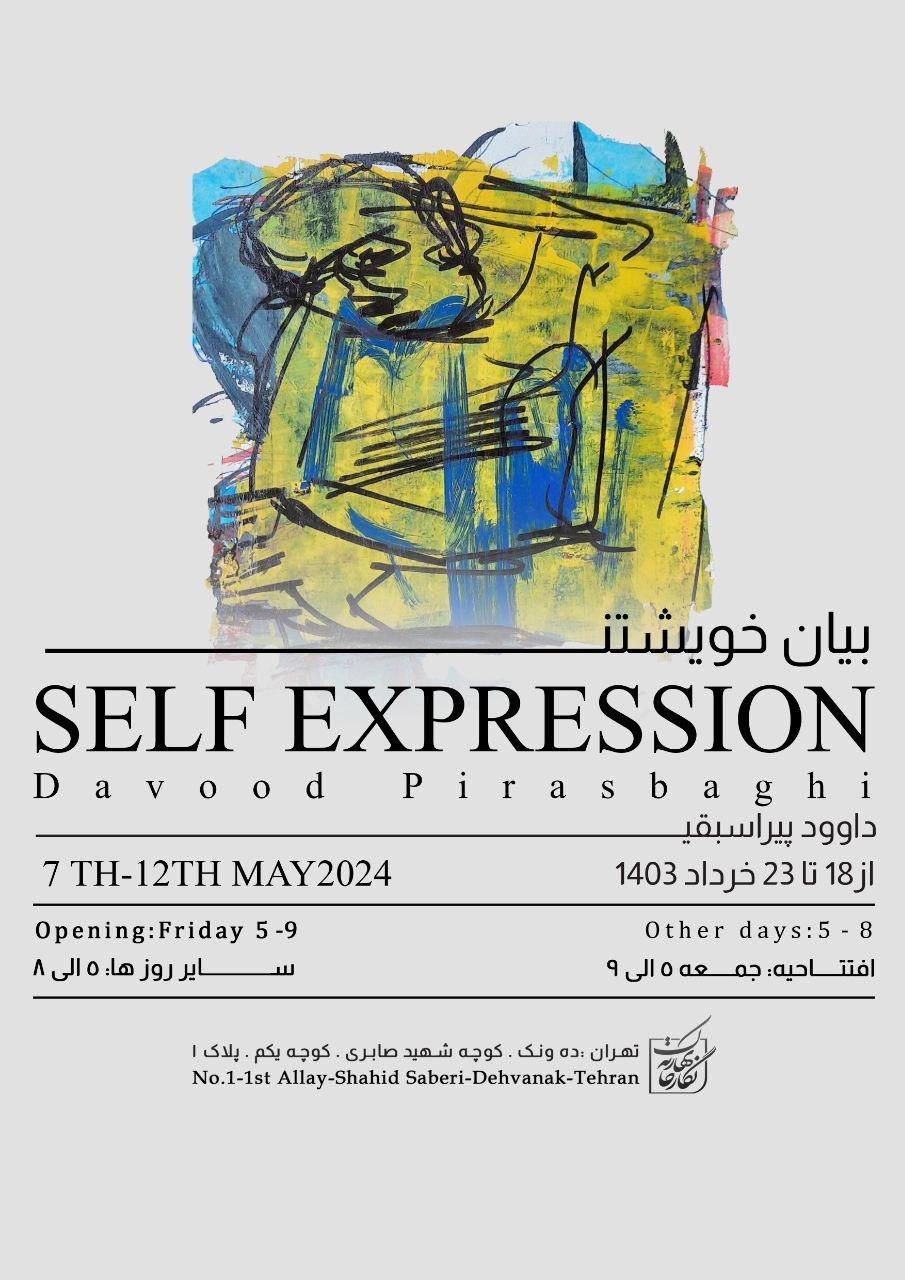 نمایشگاه انفرادی نقاشی «بیان خویشتن» با مجموعه آثاری از داوود پیراسبقی با متریال ترکیب مواد، ساعت ۱۷، روز جمعه، ۱۸ خرداد ماه ۱۴۰۳ با حضور پدیدآورنده آثار در نگارخانه بهارک افتتاح میشود.
