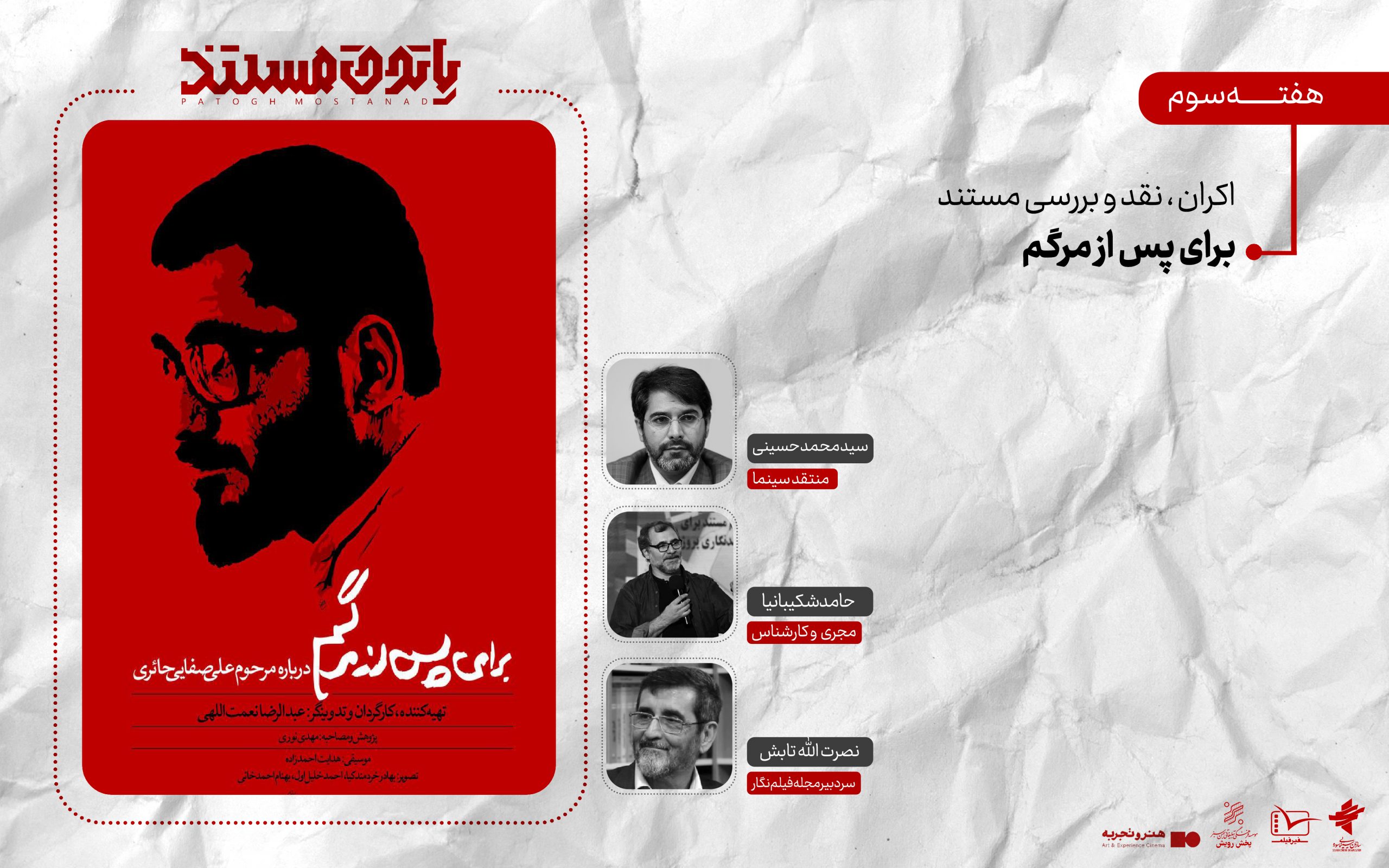 همزمان با هفته سوم برگزاری «پاتوق مستند»، مستند «برای پس از مرگم» به تهیهکنندگی و کارگردانی عبدالرضا نعمتاللهی اکران و نقدوبررسی میشود.