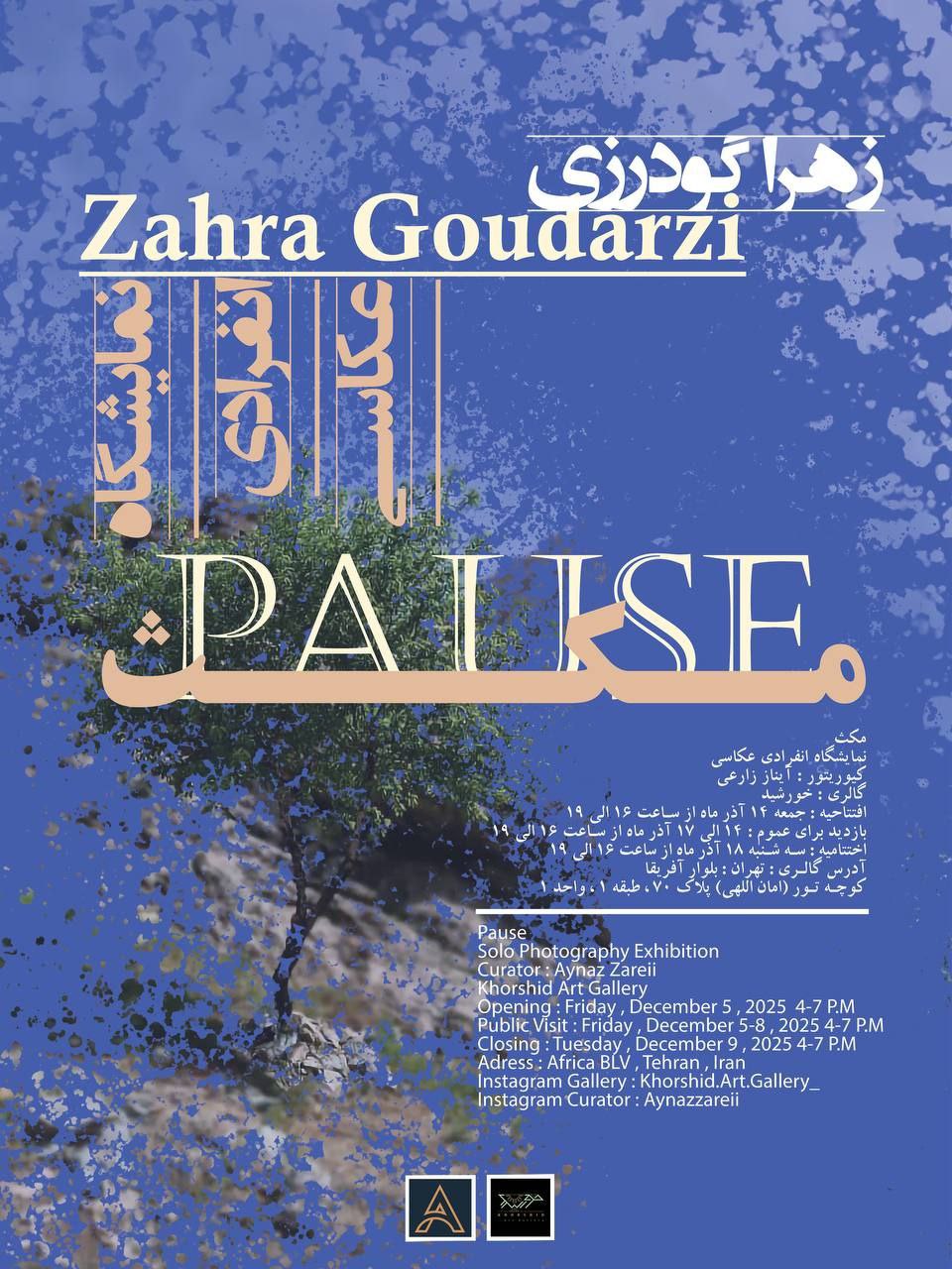 نمایشگاه انفرادی عکاسی «مکث» با مجموعه آثاری از زهرا گودرزی، ساعت ۱۶ روز جمعه، ۱۴ آذر ماه ۱۴۰۴، به کیوریتوری آیناز زارعی نقاش و مدیر گروه هنری آیتیست در گالری خورشید گشایش مییابد.