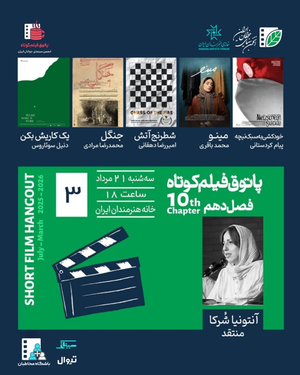سینماروزان: جلسه سوم فصل دهم پاتوق فیلم کوتاه ساعت ۱۸ سهشنبه ۲۱ مرداد ۱۴۰۴ در سالن استاد ناصری خانه هنرمندان ایران برگزار میشود.